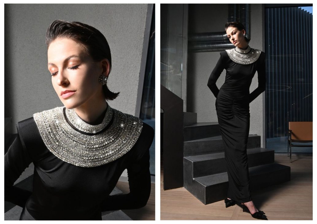 More than an accessory, the crystal embellished collar becomes a wardrobe signature. Worn over crisp shirts, sleek suits or even evening gowns, it transforms each look with an air of bold sophistication.
