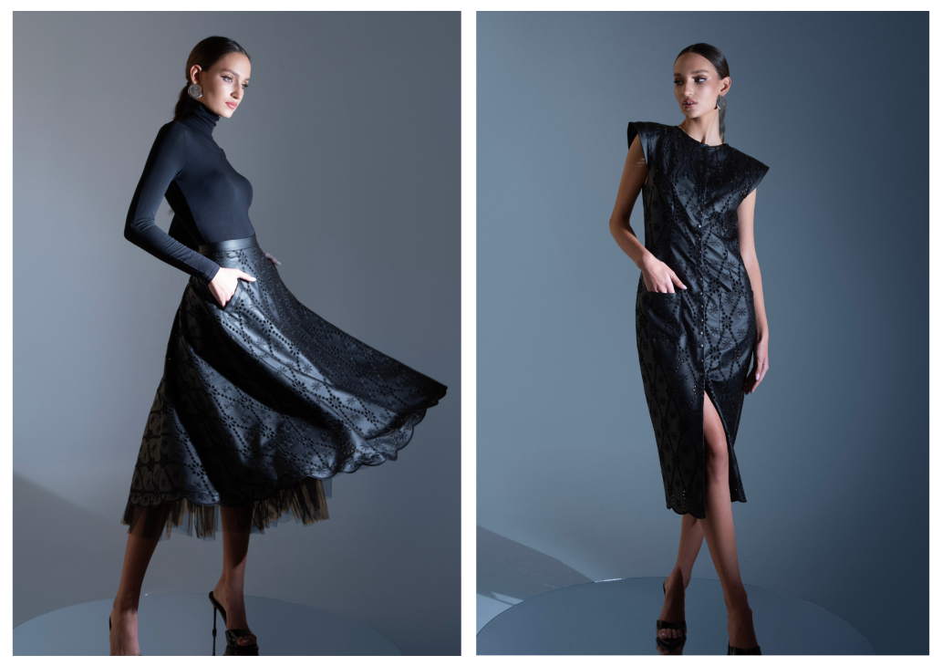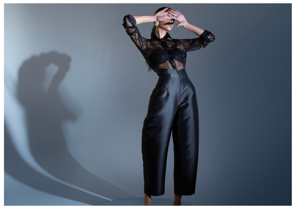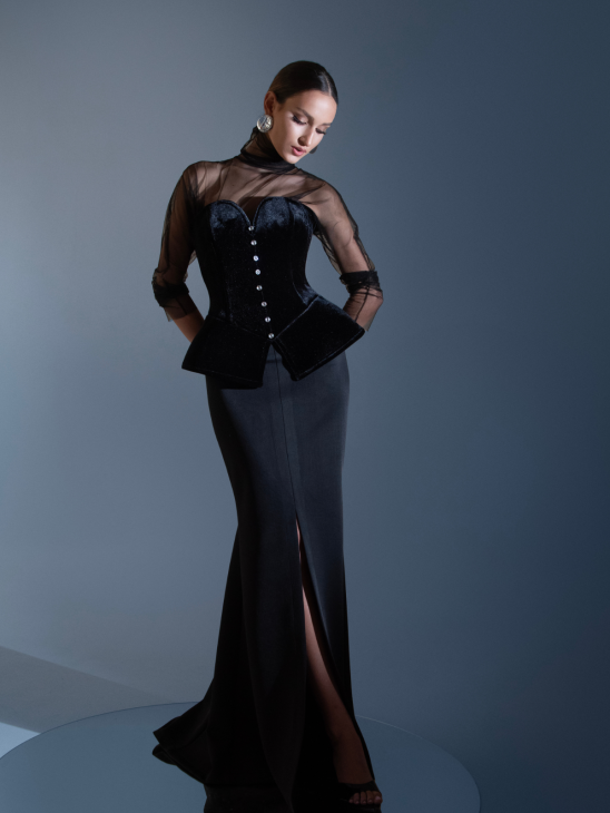 The palette led by deep black, glimmers with ascents of silver, like sparks of light across a midnight sky. Each garment feels timeless while evoking something dramatic.