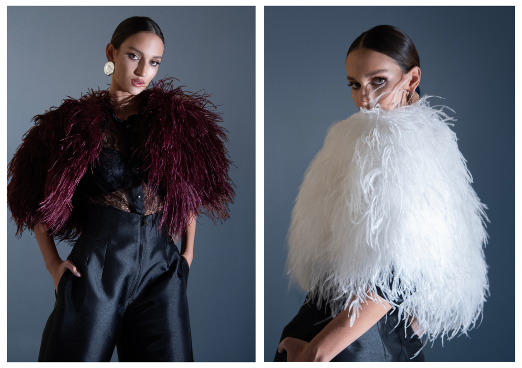 Every piece tells a story of contrast: softness against structure, delicacy alongside daring shine. Feathers bring movement to stiff bedazzled corsets and lace offers a whisper of romance to strict tailored pieces; each element harmonizing to create silhouettes of powerful femininity.